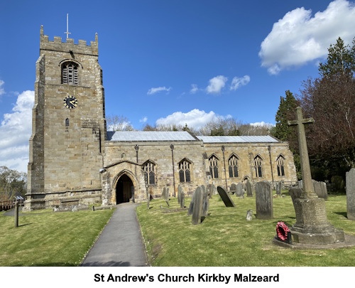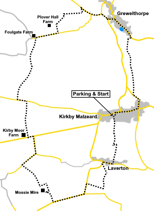 To view route as a dynamic Ordnance Survey map click here. Introduction: This is an easy circular walk through pleasant North Yorkshire countryside, starting at Kirkby Malzeard and passing through the pleasant hamlet of Laverton and Grewelthorpe village with its pretty duck pond. Kirkby Malzeard is officially a ‘town’ having been granted the right to hold a market by Edward I in 1307. Its name comes from two sources; Chirchebi, as it appears on the Domesday Book (meaning ‘church village’), which became Kirkby and Malzeard (meaning ‘bad clearing’ in Norman French. It owes its origins to farming and animals were brought to the market for sale. There is a pinfold where they were corralled. At one time it had a castle but this seems to have been demolished in 1173/4. There has been a church ay Kirkby Malzeard (St. Andrews) since around 1150 with subsequent additions. It suffered a bad fire in 1908 but was restored. The school building was built by subscription in 1862 and is still in use. You will pass it, opposite the church. There