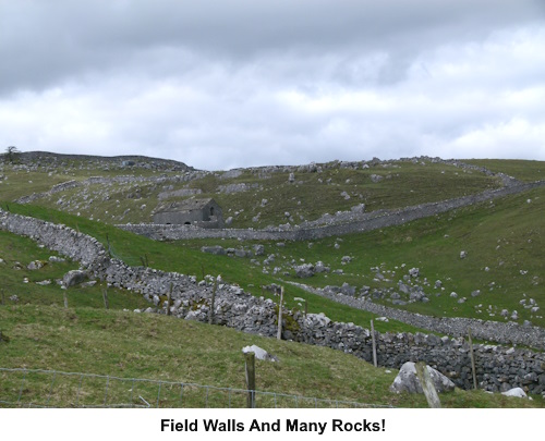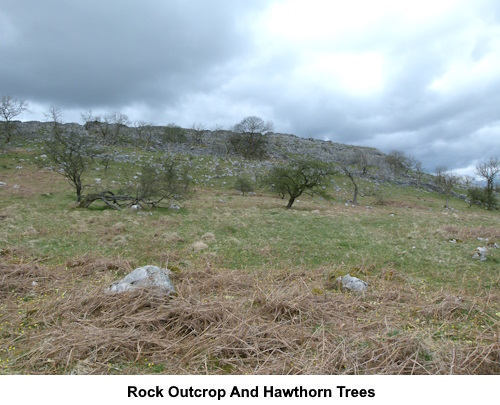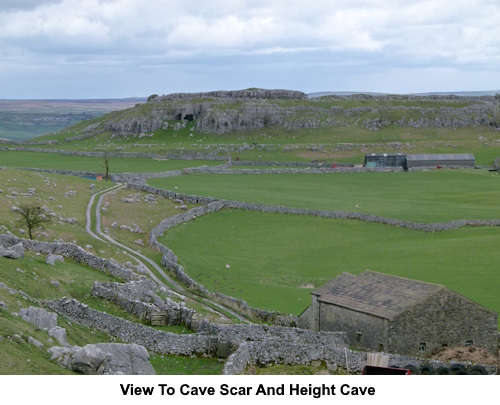 The path is obvious and drops down, passing to the right of a farmhouse, abandoned but still in good condition (Height House) (SD 963644). Beyond the farmhouse is a double gated stile. Cross this and turn right following the wall on the right. The path soon bears to the left of a small valley. Further left are limestone outcrops and a wood of small trees.