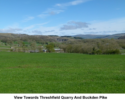 all follows distinctive Rights of Way. The walk starts from the entrance to the quarry on Skirethorns Lane at Threshfield where there is a very wide area where you can park safely. To get there, take the B6160 NW from Threshfield (near Grassington). Just after the filling station, turn left on to Skirethorns Lane. The quarry entrance is just short of half a mile from the B6160. Start: Exit the quarry entrance and turn right along the road. You will come to a crossroads with tarmac going right and left, with a stony track straight ahead. Turn left, following a sign for Grisedale Holiday Cottages (SD 978639).